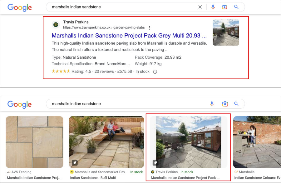 Take for example, when searching for the paving slabs ‘Marshalls indian sandstone’ they appear on the first page of search results, not only does their listing contain text but also an image to the right, helping to capture the user’s attention.