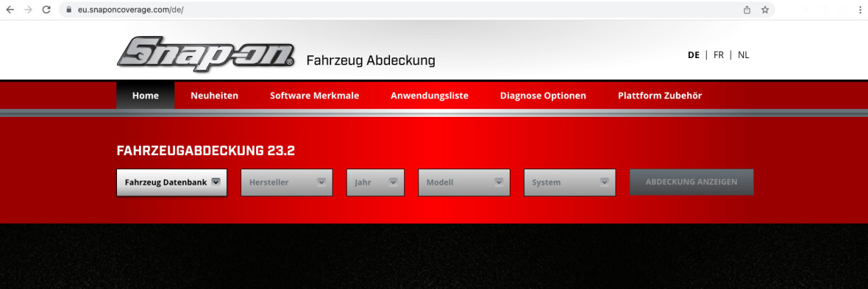 Snap-on's European vehicle coverage guide website is available in German, French and Dutch