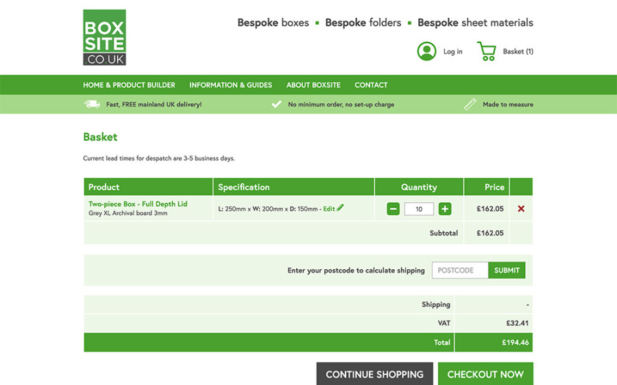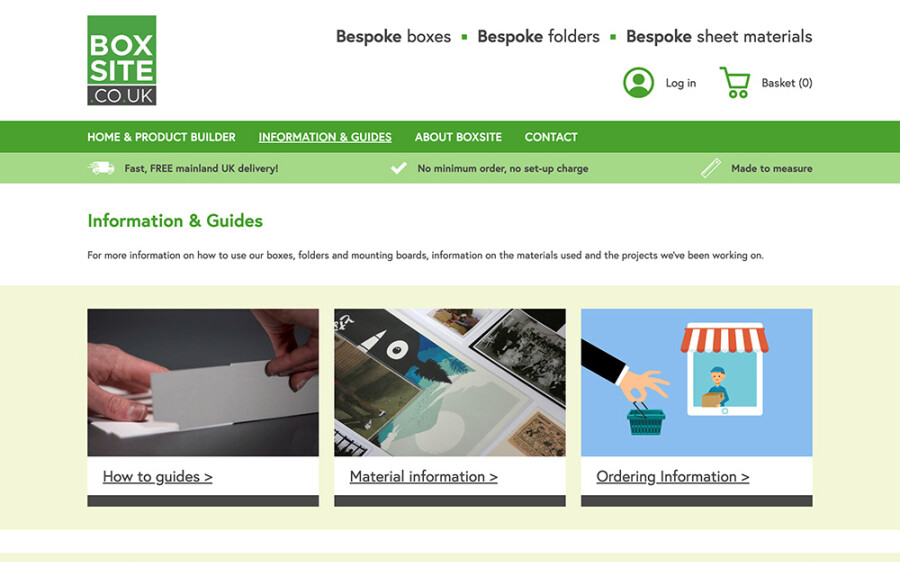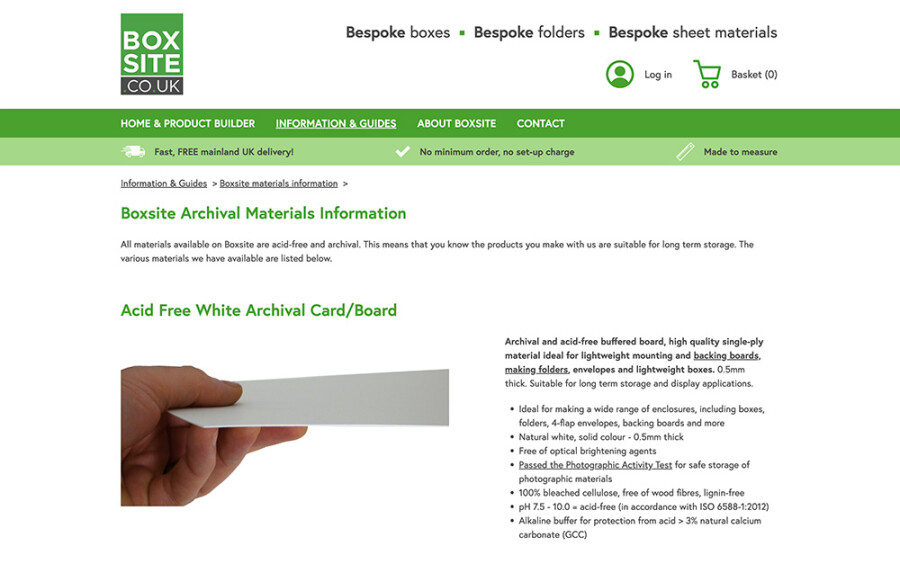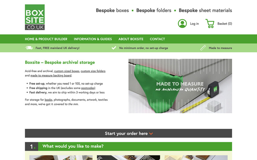 Boxsite is a service from Preservation Equipment, who specialise in products for conservation and preservation of artefacts, artwork, and archives. It allows customers to create custom boxes, folders and other archival storage based on specific requirements and order them online, even if they only need one. Bigfork built the original Boxsite a few years ago and were appointed as the website design agency by Preservation Equipment to create its successor.